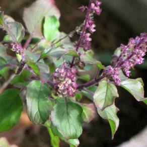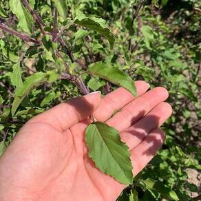 * O manjericão sagrado, é uma planta aromática e com folhas de coloração verde-claras.
