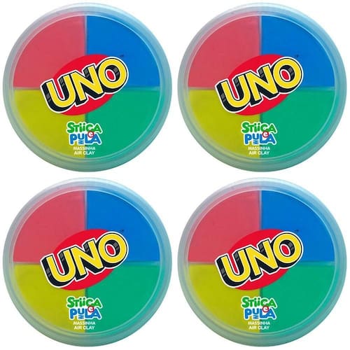 Massinha que estica, semelhante a uma slime, pula e pode ser modelada! Com as cores icônicas do jogo UNO. Há várias brincadeiras que as crianças irão adorar.