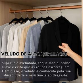 O revestimento aveludado evita que as roupas escorreguem ou fiquem marcadas, preservando melhor os tecidos. Já o gancho metálico giratório facilita o manuseio no closet ou guarda-roupa, tornando o dia a dia mais funcional. Seu formato ultrafino também contribui para uma melhor otimização de espaço.