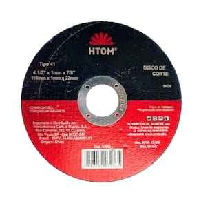 Kit com 5 Discos de Corte Fino 4 1/2 Pol. 115mm para Esmerilhadeira Inox Metal HTOM Disco de corte 115mm indicado para cortar inox e metal com esmerilhadeiras. Furo de 22mm e espessura de 1mm. - Marca: Htom - Referência: HTOM-40563 - Kit com 5 Discos - Diâmetro: 4-12 115mm - Furo: 7/8 22m - Espessura: 1mm - Indicado para corte de metais em geral e aço inoxidável - Rotação máxima: 13.300 rpm - Composição: corundum branco - : 90 dias contra defeito de fabricação Ean: 7794569495195
