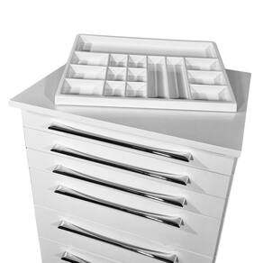 Contém 1 (uma) Mesa Auxiliar Comfort - 05 gavetas c/ puxadores premium, ideal para oferecer organização e praticidade com um toque de elegância.
