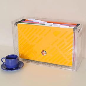 Garantia: 90 dias / Peso total: 5,54kg / Cor predominante: transparente / Ref.: 7794463444572; Dimensões de cada organizador: 43cm (C) x 14,5cm (L) x 27cm (A); Conteúdo: - 5 caixas arquivos transparentes; - 6 pastas suspensas cada; - 6 visores de etiquetas cada; - 6 etiquetas cada; - 6 grampos cada; Materiais: - Cartão Triplex Plastificado: pastas suspensas; - Poliestireno Cristal: caixa suporte; - Polipropileno: grampos plásticos; - Offset: etiquetas; - PVC: visores; Detalhes dos produto: - As caixas para arquivo transparentes possuem alças laterais e estrutura vazada; - As pastas suspensas plastificadas possuem fundo branco e hastes plásticas; - As caixas para arquivo comportam até 12 pastas suspensas cada; - As cores das pastas são diversas, sem opção de escolha; - As pastas comportam folhas de tamanho A4; - Não possuem tampas; Cuidados: não lavar com materiais abrasivos.