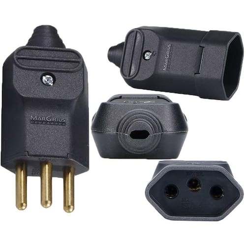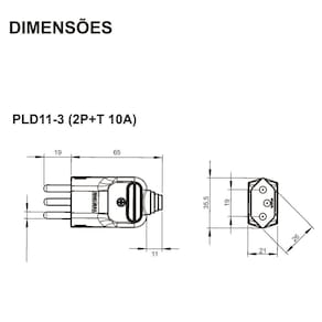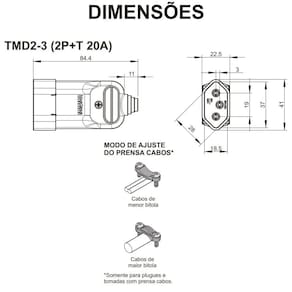 Descrição do fabricante: Conexão dos condutores através de bornes parafusados; Material de cobertura: termoplástico; Saída dos cabos 180°; Pinos e contatos em latão; Produtos Certificados pelo INMETRO; Atendem ao padrão brasileiro de plugues e tomadas (NBR 14136). Imagem de amostra do próprio produto.