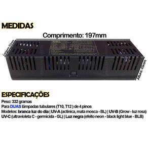 Compatibilidade: Modelos de lâmpadas: T10 T12 Quantidade de pinos na lâmpada: 4 Potência da lâmpada: 100W ou 110W Tipos de lâmpadas: Comum e ultravioletas: Branca luz do dia UVA (actínica, mata mosca BL) UVB (Grow - luz rosa) UVC (ultravioleta C - germicida - GL) Luz negra (efeito neon black light blue - BLB).