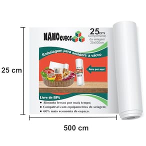 Embalagens 5 rolos NANOCUBOS 25 cm X 500 cm para seladoras a vácuo. Embalar produtos a vácuo é a melhor forma de mantê-los sempre protegidos por muito mais tempo. Ao embalar alimentos, a validade deles é completamente estendida, pois eles não terão nenhum contato com o ar e serão pouco afetados pela ação do tempo. Você pode embalar tanto alimentos crus como alimentos já preparados para serem consumidos em outro momento. Você economiza muito dinheiro e evita o desperdício Os sacos para vácuo Nanocubos são produzidos com alta tecnologia em Nylon Poli seguindo padrões de qualidade internacional. Possuem 12 micras, 3 barreiras de proteção, sem presença de BPA Não tóxicos e funcionam com equipamentos de embalagens a vácuo. Além de alimentos, é possível utilizá-lo com objetos pessoais, documentos ou utensílios, conservando-os como novos por muito tempo e aumentando sua vida útil.