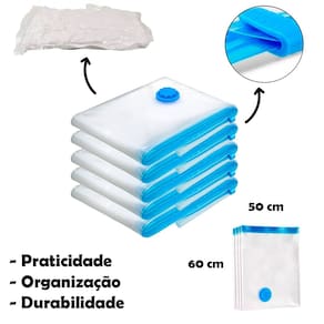 Caracteristicas do Produto: -5 unidades de saco a vacuo + bomba de ar -Elimine mofo, poeira, cheiro de guardado e insetos; -Material reutilizável, reforçado e durável; -Lacrado de verdade à prova de umidade; -Compatível com aspirador de pó e bomba manual -PVC de alta resistência e herméticos.