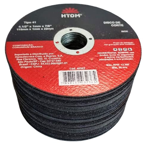 Kit com 50 Discos de Corte Fino 4 1/2 Pol. 115mm para Esmerilhadeira Inox Metal HTOM Disco de corte 115mm indicado para cortar inox e metal com esmerilhadeiras. Furo de 22mm e espessura de 1mm. - Marca: Htom - Referência: HTOM-40563 - Kit com 50 Discos - Diâmetro: 4-12 115mm - Furo: 7/8 22m - Espessura: 1mm - Indicado para corte de metais em geral e aço inoxidável - Rotação máxima: 13.300 rpm - Composição: corundum branco - : 90 dias contra defeito de fabricação