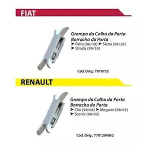 Para veículos RENAULT, o grampo é compatível com os modelos Clio 1998 até 2006 , Megane 1998 até 2005 e Scenic 1998 até 2005 .