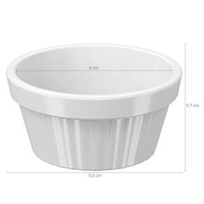Os ramekins brancos da Coza são um conjunto de 50 mini potes projetados para servir geleias, molhos, maionese, ketchup, chimichurri, vinagrete, temperos, molhos para saladas ou outros condimentos de sua escolha. Cada pote possui uma capacidade essencial para porções individuais ou pequenas quantidades de acompanhamentos. Esses mini ramequins são especialmente adaptáveis ao uso em bares, restaurantes e hotéis devido à sua capacidade de atender a uma grande variedade de necessidades culinárias. O ramequim canelado, adiciona um toque de elegância e sofisticação à apresentação dos pratos.