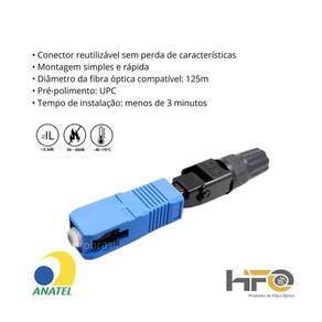 Especificações Técnicas: Conector reutilizável sem perda de características. Montagem simples e rápida. Diâmetro da fibra óptica compatível: 0.125mm. Pré-polimento: UPC. Tempo de instalação: menos de 3 minutos. Perda de inserção: menor ou igual a 0.3db. Perda do retorno: maior ou igual a - 45dB. Taxa de reflexão: maior ou igual a 50 60dB. Temperatura de Operação: - 40 +75C. Aplicações: ODF Optical Distribution Frame . ONT Optical Network Unit . FTTH Fiber to the Home . Cable TV Network.