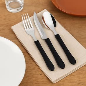 6 colher de mesa tramontina leme com lâmina em aço inox e cabo de polipropileno preto ========== sobre o produto ========== Com a colher de mesa tramontina leme com lâmina em aço inox e cabo de polipropileno preto ficou muito mais gostoso saborear suas sopas e caldos preferidos. Ela possui lâmina produzida em aço inox com alta resistência e durabilidade e seu cabo é em polipropileno, característica que proporciona um manuseio confortável e compõem sua mesa de um jeito muito especial. Ela ainda é muito fácil de limpar e pode ser lavada na máquina de lavar louças. O talher perfeito para o seu dia a dia ========== especificações ========== -6 colher de mesa tramontina leme com lâmina em aço inox e cabo de polipropileno preto - marca: tramontina - linha: leme - cor/acabamento: preto - quantidade de peças: 6 - material do talher: aço inox - material do cabo: polipropileno - comprimento: 18,6cm ========== recomendações de uso ========== - antes da primeira utilização, lave bem as peças e seque-as - tenha cuidado ao manusear produtos cortantes e perfurantes e mantenha-os fora do alcance de crianças - para maior durabilidade dos produtos, recomenda-se secar bem antes de guardar, mesmo após lavagem em máquina - para descarte dos produtos e embalagens siga as orientações de reciclagem vigentes ========== informações gerais ========== - lâmina de aço inox que garante maior resistência devido a espessura do aço e a estampagem das lâminas - possui cabo de polipropileno para maior resistência e durabilidade - pode ir à máquina de lavar louças facilitando seu dia a dia - foto meramente ilustrativa - do fornecedor: 3 meses contra defeito de fabricação P: o produto é novo ou