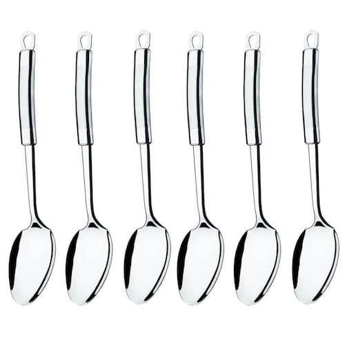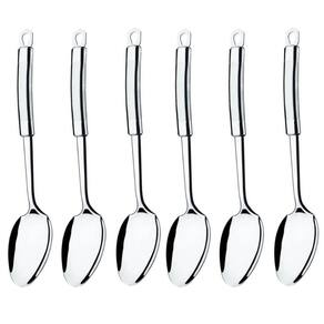 Garantia: 90 dias / Peso total: 600g / Cor predominante: inox / Referência: 7798139374385; Dimensões de cada colher: 32,5cm (C) x 5,7cm (L) x 1,5cm (A); Conteúdo: 6 colheres de servir; Material: aço inox.