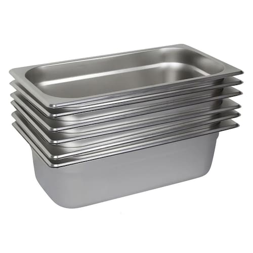 Kit com 6 cubas GN 1/9 de 100mm. Perfeito para molhos, saladas e guarnições em serviços padronizados e compactos.