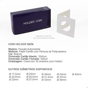 O Coins Holder Autocolante é uma importante ferramenta para armazenar e proteger suas Moedas. É um produto utilizado por colecionadores e coleções de todos os níveis: do iniciante ao avançado. Garante o bom armazenamento e proteção de suas peças.O Coins Holder tem como função proteger sua moeda:- evita o contato com o ambiente externo- evita o manuseio incorreto da peça (sem luvas ou com a mão suja)- facilita a exposição de sua peça na sua coleção- facilita a logística de sua peça, permitindo que você leve em eventos ou para negociar com mais praticidade e proteção- excelente organizador, pois centraliza a moeda no bolso da folha, deixando sua exibição muito mais bonita, organizada e apresentávelNo critério de organização, o Coins Holder se destaca ao promover a padronização da exposição de suas moedas. Tenha uma apresentação muito mais bonita e profissional utilizando Coins Holders.CARACTERÍSTICAS:Modelo: Fixação AutocolanteMaterial: Papel Cartão Branco com Película de PolipropilenoDimensão Cartão Aberto: 10x5cmDimensão Cartão Fechado: 5x5cmDiâmetro deste Anúncio: Ø 25mmEmbalagem: Caixa com 30 alvéolos (coins holder) cada caixaSUGESTÃO DE ARMAZENAMENTO DO COINS HOLDER COM A MOEDAO Coins Holder pode ser armazenado em folhas próprias para coleções de Moedas respeitando o espaço mínimo de 5x5cm cada bolso onde o holder será colocado, caixas organizadoras e separadoras, estojos (cartelas dobráveis) próprios para Coins Holders.COMO UTILIZAR:1- Para utilizá-lo você deve primeiramente dobrar ao meio, na marcação indicada, para facilitar o fechamento com a moeda.2- Em seguida, você deverá posicionar a moeda no centro do Coins Holder, em cima da película de plástico, onde a moeda será exibida. Certifique-se de que sua moeda está perfeitamente alinhada com alguma das laterais do Coins Holder pois após fecha-lo, não conseguirá mais mover a moeda.3- Dobre o coin holder ao meio, por cima da moeda, envolvendo-a completamente até colar.