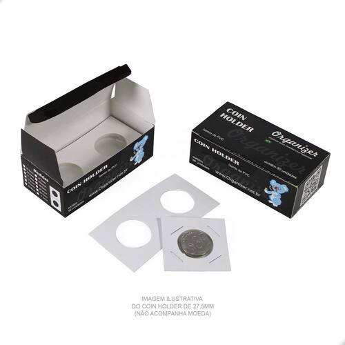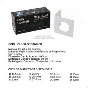 O Coins Holder Grampeável é uma importante ferramenta para armazenar e proteger suas Moedas. É um produto utilizado por colecionadores e coleções de todos os níveis: do iniciante ao avançado. Garante o bom armazenamento e proteção de suas peças.O Coins Holder tem como função proteger sua moeda:- evita o contato com o ambiente externo- evita o manuseio incorreto da peça (sem luvas ou com a mão suja)- facilita a exposição de sua peça na sua coleção- facilita a logística de sua peça, permitindo que você leve em eventos ou para negociar com mais praticidade e proteção- excelente organizador, pois centraliza a moeda no bolso da folha, deixando sua exibição muito mais bonita, organizada e apresentávelNo critério de organização, o Coins Holder se destaca ao promover a padronização da exposição de suas moedas. Tenha uma apresentação muito mais bonita e profissional utilizando Coins Holders.CARACTERÍSTICAS:Modelo: Fixação por GrampoMaterial: Papel Cartão Branco com Película de PolipropilenoDimensão Cartão Aberto: 10x5cmDimensão Cartão Fechado: 5x5cmDiâmetro deste Anúncio: Ø 35mmEmbalagem: Caixa com 50 alvéolos (coins holder) cada caixaOBS: Isento de PVCSUGESTÃO DE ARMAZENAMENTO DO COINS HOLDER COM A MOEDAO Coins Holder pode ser armazenado em folhas próprias para coleções de Moedas respeitando o espaço mínimo de 5x5cm cada bolso onde o holder será colocado, caixas organizadoras e separadoras, estojos (cartelas dobráveis) próprios para Coins Holders.COMO UTILIZAR:1- Para utilizá-lo você deve primeiramente dobrar ao meio, na marcação indicada, para facilitar o fechamento com a moeda.2- Em seguida, você deverá posicionar a moeda no centro do Coins Holder, em cima da película de plástico, onde a moeda será exibida. Certifique-se de que sua moeda está perfeitamente alinhada com alguma das laterais do Coins Holder pois após fecha-lo, não conseguirá mais mover a moeda. 3- Dobre o coins holder ao meio, por cima da moeda, envolvendo-a completamente. 4- Com um grampeador, grampeie a parte branca do Coins Holder. É sugerido que o grampo seja aplicado bem posicionado entre a moeda e o final do Coins Holder, pois assim prenderá corretamente a peça evitando que a mesma movimente. Também é sugerido 4 grampos para o bom fechamento do Coins Holder, mas fica a critério de cada colecionador.