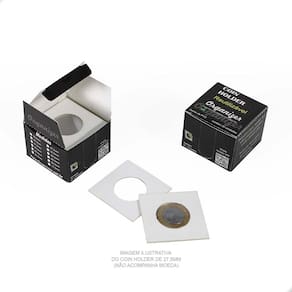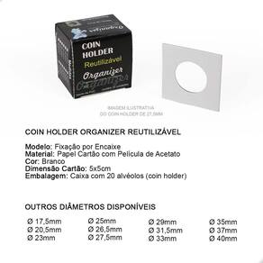 O Coins Holder Reutilizável é uma importante ferramenta para armazenar e proteger suas Moedas. É um produto utilizado por colecionadores e coleções de todos os níveis: do iniciante ao avançado. Garante o bom armazenamento e proteção de suas peças.O Coins Holder tem como função proteger sua moeda:- evita o contato com o ambiente externo- evita o manuseio incorreto da peça (sem luvas ou com a mão suja)- facilita a exposição de sua peça na sua coleção- facilita a logística de sua peça, permitindo que você leve em eventos- excelente organizador, pois centraliza a moeda no bolso da folha, deixando sua exibição muito mais bonita, organizada e apresentávelNo critério de organização, o Coins Holder se destaca ao promover a padronização da exposição de suas moedas. Tenha uma apresentação muito mais bonita e profissional utilizando Coins Holders.CARACTERÍSTICAS:Modelo: Fixação por Encaixe (Reutilizável)Material: Papel Cartão Branco com Película de AcetatoDimensão Cartão Fechado: 5x5cmDiâmetro deste Anúncio: Ø 20,5mmEmbalagem: Caixa com 20 alvéolos (coins holder) cada caixaOBS: Isento de PVCSUGESTÃO DE ARMAZENAMENTO DO COINS HOLDER COM A MOEDAO Coins Holder pode ser armazenado em folhas próprias para coleções de Moedas respeitando o espaço mínimo de 5x5cm cada bolso onde o holder será colocado, caixas organizadoras e separadoras, estojos (cartelas dobráveis) próprios para Coins Holders.COMO UTILIZAR:1- Para utilizá-lo você deve primeiramente arrastar uma das películas de acetato para um dos dois lados do coin holder.2- Encaixe a moeda no orifício do papel.3- Reposicione a película em sua posição inicial.