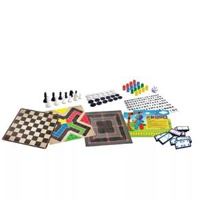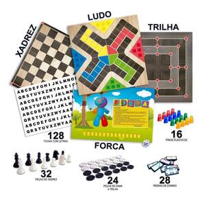 Reviva a diversão dos jogos de tabuleiro com este incrível kit contendo 6 clássicos indispensáveis: Xadrez, Dama, Ludo, Trilha, Dominó e Jogo da Força.