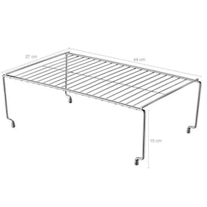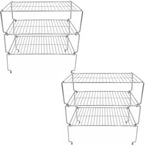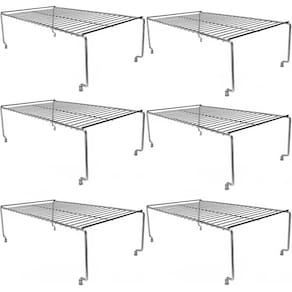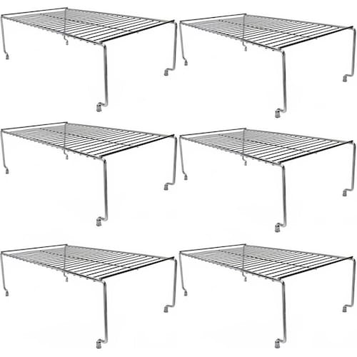 Uma ótima opção para facilitar a sua vida são os organizadores de armário. Este kit com 6 organizadores são componíveis, eles podem ser usados empilhados todos juntos totalizando 6 níveis ou como preferir. Este aramado possui hastes espaçadas de 1,5cm permitindo a ventilação entre os objetos. Agora você pode ampliar o espaço da prateleira e organizar sua cozinha, quarto ou banheiro sem precisar de instalações, parafusos ou bucha, basta ajustá-lo no espaço e pronto.