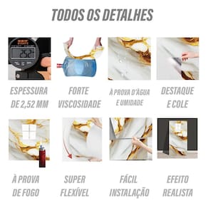 - Reprodução autêntica do mármore. - Ótimo custo-benefício. - Alta qualidade com junções perfeitas. - Aplicação rápida, sem odores, e com fixação de cola resistente. - Esconde imperfeições como mofo e rachaduras. - Compatível com tendências de decoração. - Recortes para facilitar instalação em torno de tomadas e interruptores. - Seguro para crianças. - Auxilia no isolamento acústico e térmico. - Impermeável e padronizado em tons e estampas.