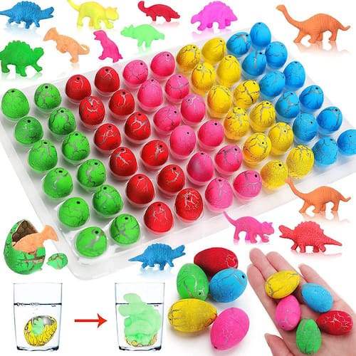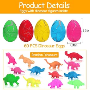 ?Easter Surprise Dino Eggs?Super Value Pack de ovos de dinossauro de 60pcs. Os ovos de Páscoa podem chocar vários dinossauros, incluindo Tyrannosaurus Rex, Spinosaurus, Triceratops, Heterodon, Ankylosaurus, Diplodocus. As crianças estarão cheias de surpresas nos jogos de caça aos ovos de Páscoa. ?Brinquedos de Dinossauro Hatching inovador?Juste em seguida em uma tigela de água (