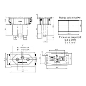Tomada Margirius preta 3p 10A modelo TPA2-3 E4F, para painéis e aparelhos.Descrição do fabricante:Características elétricas: 10A em tensões de até 250~;Poço interno;Material da cobertura em termoplástico;Contatos em latão;Atendem ao novo padrão brasileiro de plugues e tomadas (NBR 14136).Imagem de amostra do próprio produto.Itens Inclusos:60 Tomada Fêmea Preta 3 Pinos 10a Painel Preto Margirius 40 Tomada Fêmea Preta 3 Pinos 10a Painel Azul Margirius