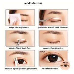 Como colocar: Lave o rosto, limpando a região dos olhos, principalmente, as pálpebras. Seque bem com uma toalha bem macia. Encontre o côncavo dos olhos, pressionando suavemente. Com a ajuda de uma pinça de ponta fina, pegue na ponta da fitinha, desgrudando-a da embalagem, ele não é dupla face. Coloque a ponta da fita com cola bem em cima do côncavo do olho e afunde a fita, escondendo-a com a pele da pálpebra que está sobrando, colando sobre a fita. Repita os mesmos procedimentos no outro olho.