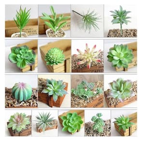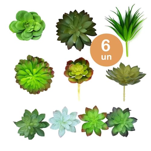 6un planta suculenta artificial decoração vasinhos arranjos 6un planta suculenta artificial para decoração vasinhos arranjos Este kits contém: 6 plantas suculentas artificiais são enviados modelos Não acompanha vasos e/ou cachepots As suculentas são ideais para decoração de mini vasos, cachepots, jardins artificiais com muita realidade e naturalidade. Ideal para harmonizar em qualquer ambiente como, mesas e bancadas de cozinha, escritórios, banheiros e onde mais sua imaginação permitir. Fabricadas com material de excelente qualidade, plastico siliconado, transmitem realidade, parecendo plantas reais com grande durabilidade Não acompanha vasos e/ou cachepots Medida de cada plantinha: os tamanhos podem variar de acordo com o modelo entre variam de 5 a 10cm. Material: plastico siliconado e metal As hastes semi rígidas permitem que possam ser fixadas em diferentes bases, mantendo seu arranjo sempre bonito e arrumado. Marca: Não Informado