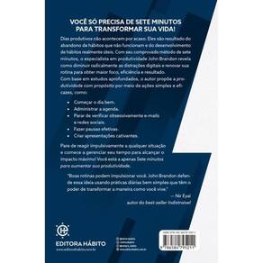 VOCÊ SÓ PRECISA DE SETE MINUTOS PARA TRANSFORMAR SUA VIDA! Dias produtivos não acontecem por acaso. Eles são resultado do abandono de hábitos que não funcionam e do desenvolvimento de hábitos realmente úteis. Com seu comprovado método de sete minutos, o especialista em produtividade John Brandon revela como diminuir radicalmente as distrações digitais e renovar sua rotina para obter maior foco, eficiência e resultado. Com base em estudos aprofundados, o autor propõe a produtividade com propósito por meio de ações simples e eficazes, como: • Começar o dia bem. • Administrar a agenda. • Parar de verificar obsessivamente e-mails e redes sociais. • Fazer pausas efetivas. • Criar apresentações cativantes. Pare de reagir impulsivamente a qualquer situação e comece a gerenciar seu tempo para alcançar o impacto máximo! Você está a apenas Sete minutos para aumentar sua produtividade. Marca: HABITO EDITORA