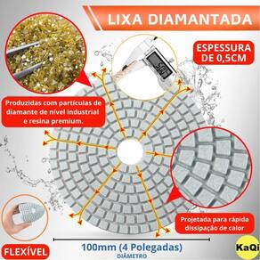 Transforme o acabamento das suas superfícies com as Lixas Diamantada 4 Polegadas 100mm da KaQi + Disco Suporte Prato 4 Polegadas 100mm M14 Desenvolvida para oferecer o melhor polimento e acabamento, é perfeito para quem busca resultados profissionais, tanto em pedras como granitos, mármores, cerâmicas, quanto ardósia, calcário, dekton, quartzo, porcelanato, pedra projetada, concreto, nanoglass, super nano, vidro e muito mais. Seu lixamento pode ser a seco e a úmido, o que proporciona um processo mais rápido, sem gerar calor excessivo. Assim, é possível garantir um resultado sem manchas ou falhas, e ainda favorece um efeito brilho d'água incrível