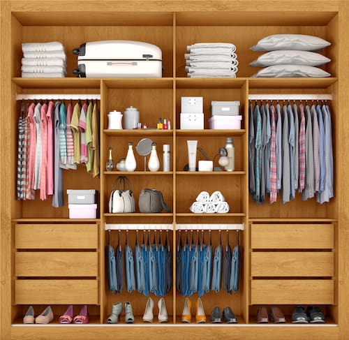 Conta com gavetas internas com corrediças telescópicas, garantindo abertura suave e total aproveitamento do espaço. Os cabideiros e calceiros metálicos