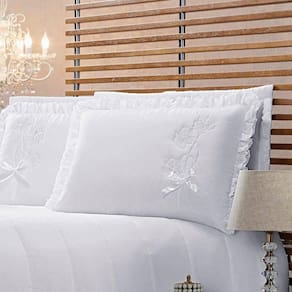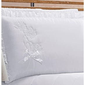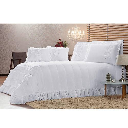 A Linha Lua de Mel da Casaborda foi criada com muito cuidado e com detalhes especialmente delicados para uma noite romântica e inesquecível. Fabricada tecido voil importado e com a mais alta tecnologia e produtos de altíssima qualidade, que garantem um acabamento perfeito ao produto. Esta linha veio para encantar com ar romantismo e sofisticado que vai deixar seu quarto maravilhoso. Confeccionado em tecido Voil importado 100% poliéster, matelassado com detalhes em bordado e laços em fita. Composição: 1 Cobre leito matelassado 2,60m comp. x 2,40m larg. 2 Porta travesseiros bordados 75cm x 55cm 2 Capas almofadas bordadas 50cm x 50cm 2 Refis almofadas 45cm x 45cm