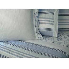 Branco, com listras em azul, esses lençóis dão mais charme para a sua cama.