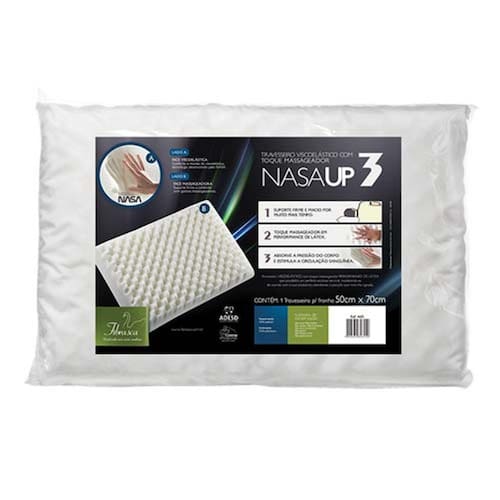 Conforto, saúde e técnologia, é a maior preocupação na hora de dormir. Obter um travesseiro que melhor acomode a pessoa, também é outro fator importante no relaxar do sono. O travesseiro Nasa UP 3 vem para proporcionar tudo isso! Desenvolvido em 3 fortes conceitos funcionais, este travesseiro: 1º Proporciona a absorção do peso exercido sobre ele, proveniente do viscoelástico; 2º possui sistema de espuma perfilada na face posterior ao visco, que forma os gomos massageadores, proporcionando um toque macio, confortável e diferenciado; 3º Proporciona também através da espuma perfilada, sustentação de altura ao travesseiro de viscoelástico, sendo este produto metade em visco e metade gomos massageadores em espuma perfilada, proporcionando assim total apoio a cabeça. Além disso este travesseiro possui ambiente impróprio para a proliferação de ácaros devido ao enchimento que este possui. Seu revestimento é composto em malha, tornando seu toque ainda mais macio. São 3 modalidades de conforto! A 3ª geração de viscoelástico da Fibrasca! Saúde, conforto e técnologia é Fibrasca!