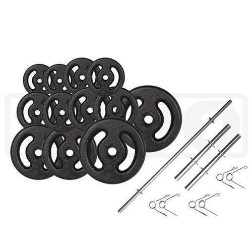 As anilhas que acompanham o kit Anilhas Ferro Fundido 50 KG + Barras Com Presilhas, são fabricadas em ferro fundido, com pintura na cor preta dando um acabamento especial ajudando na proteção contra oxidação. As anilhas possuem marcação da numeração referente ao seu respectivo peso além de possuírem vão para pegada podendo ser utilizada em diversos outros exercícios. As anilhas possuem furação central com diâmetro de 33mm, servindo assim para a grande maioria das barras.