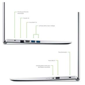 Características Gerais: Modelo: Aspire 3 Referência de modelo: A315-58-38SD Tela: 15.6 polegadas Tipo de tela: Antirreflexo Resolução da tela: Full HD 1920 x 1080 pixels Formato da tela: 16:9 Touchscreen: Não Processador: 11ª Geração, i3 1115G4 Memória de cache: 6MB Intel Smart Cache MB Frequência/velocidade clock: até 4.10GHz Sistema operacional: Windows 11 - 64 bits Disco Rígido -HD-: 256 GB SSD PCIe 3.0 x4 NVMe -M.2 2280- Memória RAM: 4GB-4GB Soldada- RAM DRR4 Memória expansível até: Até 20 GB -1 slot livre no total- Leitor de cartões de memória: Não possui Modelo da placa de vídeo: Intel UHD Graphics Wi-Fi: IEEE 802.11ª/b/g/n/ac Bluetooth: 5.1 Alto falantes: 2 alto falantes estéreos Microfone: Microfone digital integrado Webcam: 1280x720 de resolução e Gravação de audio e video em 720p Teclado: Tipo membrana em português do Brasil padrão ABNT 2, atalho com função multimídia -Play/pause, parar, voltar, avançar, aumentar volume e diminuir volume- e teclado numérico Touchpad: Multi-gestual Softwares inclusos: Acer Care Center, Acer Configuration Manager, Acer Product Registration, Norton? Internet Security e Quick Access. Segurança: Senha para proteção da BIOS e HDD, Slot para trava Kensington, Solução TPM em firmware -fTPM- Bateria: 3 células -Li-Íon- 36Wh mAh Duração da bateria: Até 8 horas -depende das condições de uso- Fonte de alimentação: Adaptador AC de 3 pinos -45W- com cabo com Certificação INMETRO Homologação Anatel: 05788-17-04423 Marca: Acer