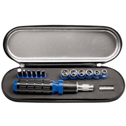 Vêm com peças fundamentais como: chave com enxaixe para adaptar ponteiras ou soquetes, adaptador para soquetes 1/4", soquetes sextavados 1/4" em aço carbono, ponteiras cruzadas em aço especial, ponteiras chatas em aço especial, extensão para ponteiras e estojo de metal com zíper e berço em EVA.