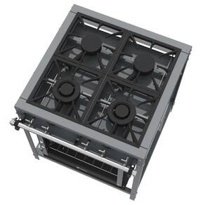 Além disso, conta com um puxador ergonômico, travamento mecânico, 1 prateleira removível, além de 4 queimadores com diâmetro 200 mm, bem como bandejas coletoras, mesa em aço carbono em formato de U e registro à gás com manípulos expostos e de fácil manuseio.