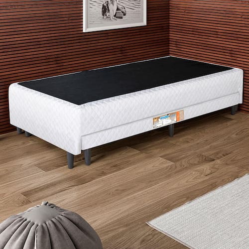 Estruturada em madeira de eucalipto, a base box possui pés fixos em PVC para melhor estabilidade, revestimento em tecido poliéster, acabamento de alta qualidade e maior resistência para suprir as necessidades do cotidiano.