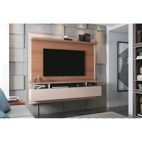 Painel para TV sobreposto com fita de LED embutida; 2 Portas basculantes com dobradiças metálicas; Tampo Chanfrado com borda em pintura P.U Alto Brilho; Prateleira superior com espessura de 37mm; Estrutura em MDP e MDF de 37mm, 18mm e 15mm.