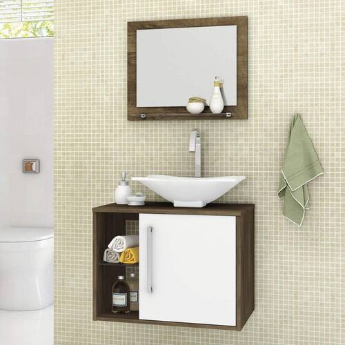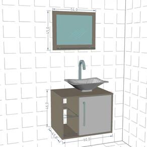 Conjunto para Banheiro Espelheira e Gabinete, elaborado em MDP com espessuras de 12mm e 15mm. Pintura da superfície em verniz poliéster brilhante, com secagem uv e impressão a laser. Acabamento nas bordas com fita de papel decorativo aplicado mecanicamente por sistema hot melting. Prateleiras de vidro de 4mm, puxador de plástico com acabamento cromado, dobradiças metálicas.