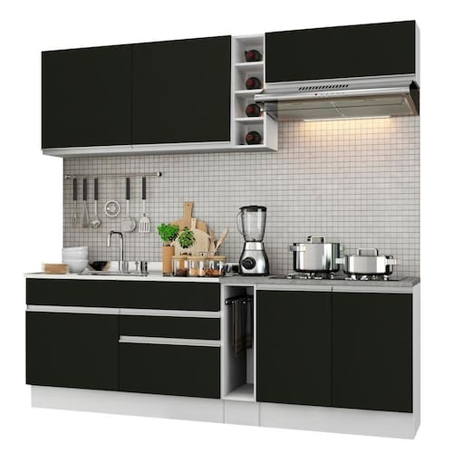 Itens inclusos: - Um (1) Balcão de Pia com duas (2) gavetas e uma (1) porta (Não acompanha tampo deste balcão) - Um (1) Porta-Panos com tampo em MDP - Um (1) Balcão com duas (2) portas e tampo em MDP - Um (1) Armário Aéreo com duas (2) portas com detalhe - Um (1) Armário Aéreo com uma (1) porta basculante - Uma (1) Adega