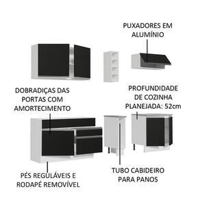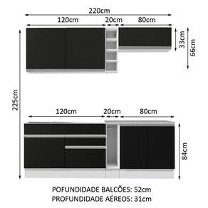 A profundidade é de cozinha planejada: 52 cm nos balcões e 31 cm nos aéreos. As medidas totais são: 220 cm de largura e 225 cm de altura.