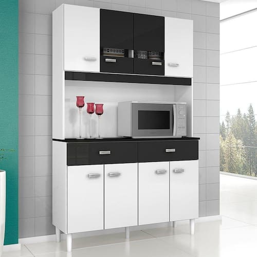 Composta por 8 portas com dobradiças metálicas e 2 gavetas com corrediças metálicas, ideal para espaços pequenos.