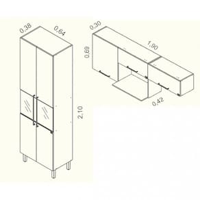 Medida de cada item (A x L x P): Paneleiro (210cm x 38cmx64cm), Armario1,20 Armário70 (69cmx190cmx30cm)
