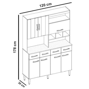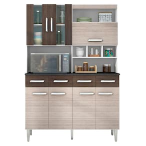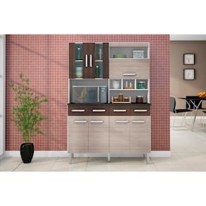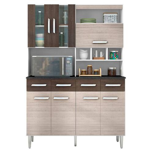 Confeccionado em MDP, ele possui um designer moderno e clean, bastante espaço para organizar utensílios. Conta com sete portas, sendo que duas tem detalhe em vidro, quatro gavetas espaçosas, espaço dedicado para alocar forno elétrico ou microondas, nichos funcionais e acabamento em pintura UV de alta resistência.