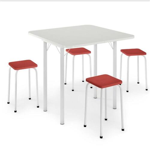 É o conjunto perfeito para a sua cozinha! Caracteristicas: Mesa Dobrável com 4 banquetas - Branca Tubo na Mesa 1 e 1/4 pol Tubo na Banqueta 3/4 pol Pintura nos tubos em epoxi Tampo da Mesa em BP Assento em corino Dimensões: Mesa Aberta: Altura: 80 cm Profundidade: 70 cm Largura: 70 cm Mesa Fechada: Altura: 80 cm Profundidade: 35cm Largura: 70 cm