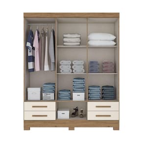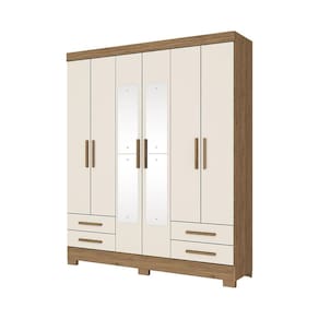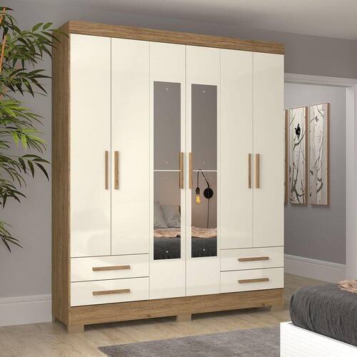 Portas centrais com espelhos, 4 gavetas externa com corrediças de metal que proporciona um fechamento sutil, portas e gavetas com puxadores MDF revestidos, possui laterais e frentes de 15mm, cabideiros de madeira revestido, dispõe de pés em ABS inclusos evitando o contato direto com a superfície