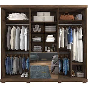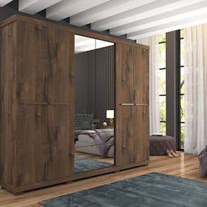 Guarda-roupa de 6 portas, sendo as duas portas central e gavetas com espelhos, que dão ao roupeiro um designe diferenciado, gavetas com corrediças telescópicas que garantem um deslizar suave, colmeia organizadora que permite melhor organização, puxadores em aluminio, 100% MDF.