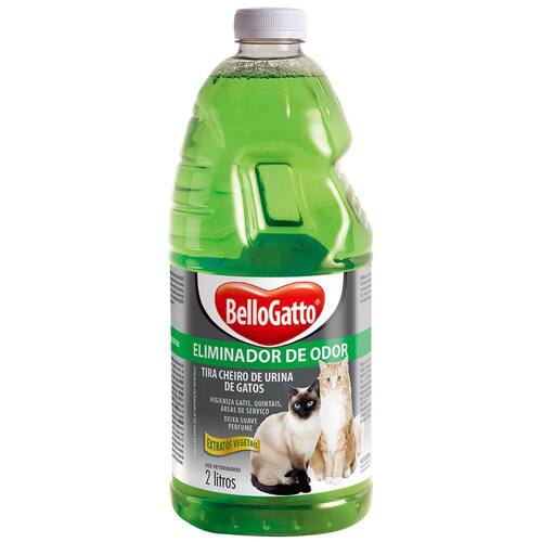 Eliminador de Odor BelloGatto Extratos Vegetais - 2 Litros - Indicado para gatos; - Elimina o mau odor; - Garante higienização e desodorização; - Deixa o ambiente perfumado; - Feito com extrato de erva-de-santa-maria. O Eliminador de Odor BelloGatto Extratos Vegetais é ideal para eliminar o mau odor do xixi e cocô do gato. O Eliminador de Odor garante a higienização e desodorização de gatis, banheiros, áreas de serviço e quintais. Feito com extrato de erva-de-santa-maria, o Eliminador de Odor deixa o ambiente perfumado. Modo de usar Use concentrado ou dilua de acordo com a intensidade do cheiro a ser eliminado. Em superfície com odor forte use sem diluir por 5 minutos e enxágue.