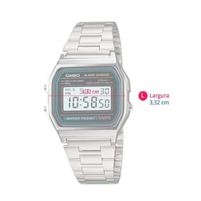 Características: Linha: Vintage Modelo: A158WA-1DF Fabricante: Casio Marca: Casio Material da Pulseira: Aço Material da Caixa: Resina Funções: Indicador 12/24h Cor da Caixa: Prata Design do Relógio: Fashion Tipo de Relógio: Digital Cor do Mostrador: Preto Cor da Pulseira: Prata Tipo de Fecho: Pressão Formato da Caixa: Retangular
